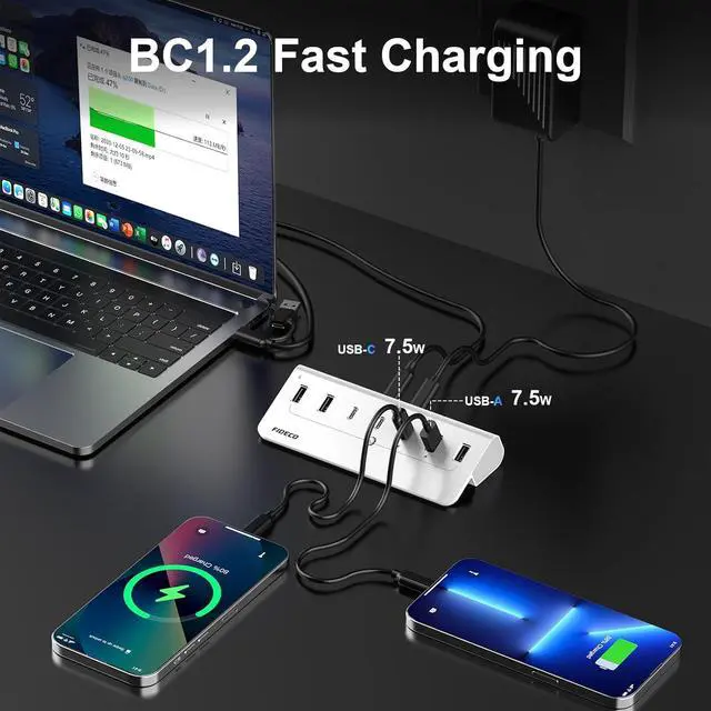 Support BC1.2 ChargingOne USB A port and one USB C port can support BC1.2 charging, and our USB hub can support data transfer and device charging simultaneously. Therefore, the powered USB hub can absolutely save your time, help eliminate dangling cords or unsightly plugs, and help you get rid of the messy desk.