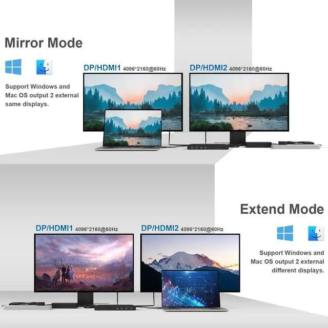 13-in-1 Laptop Docking Station: Expand your workspace with a powerful USB-C docking station featuring 13 essential ports. This laptop dock supports dual 4K@60Hz monitors setups even on mac systems limited to one display, and delivers up to 100W charging for all day productivity.