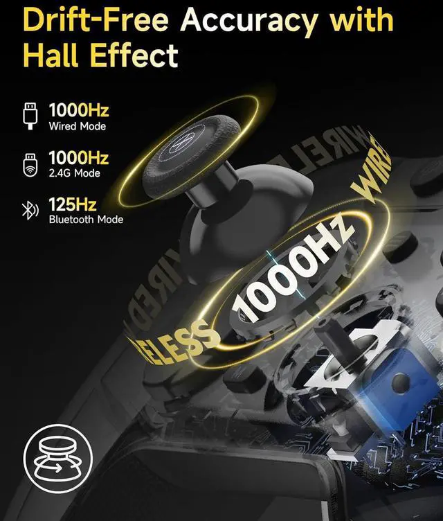 Hall Effect Joysticks + 1000Hz Polling Rate High-precision 11-bit sensors deliver drift-free accuracy and long-lasting durability. Wired & 2.4G wireless controller pc modes support 1000Hz ultra-fast response, while bluetooth controller pc mode offers 125Hz for mobile or casual gaming.
