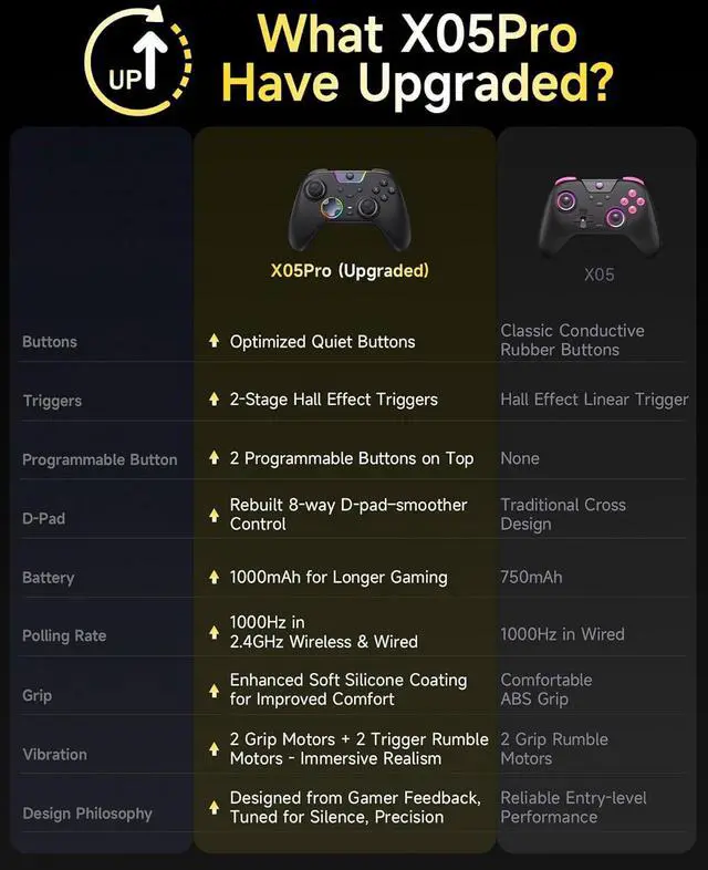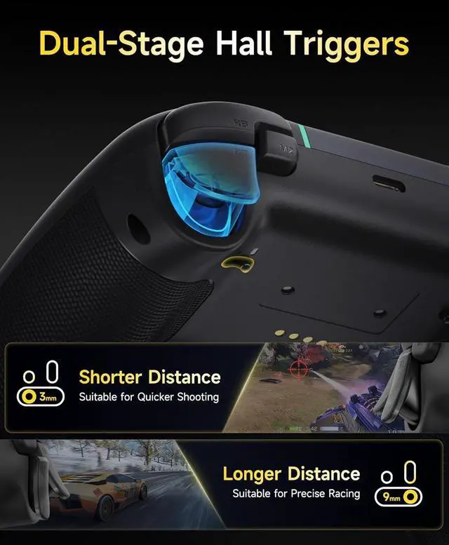 Dual-Stage Impulse Triggers Adjustable trigger lock for long or short travel, paired with 2+2 built-in rumble motors for realistic recoil, drift, and collision feedback. Ideal for pc gaming controller users who want immersive racing or FPS experiences.