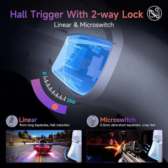 Adjustable Trigger Lock Two lock positions allow you to switch between ultra-fast actuation (FPS) and smooth deep travel (racing), giving you tailored control.