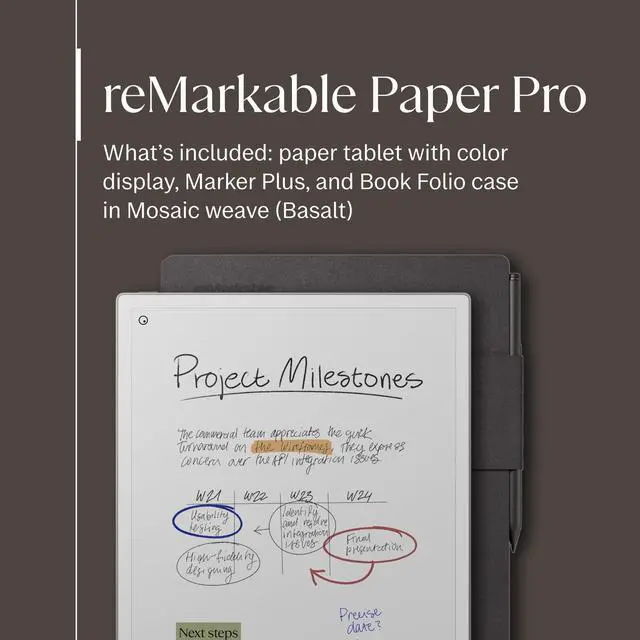 THE ULTIMATE PAPER TABLET For the first time on a reMarkable paper tablet, you can write, sketch, and read in color. Ultra-slim and portable, but with a full-size 11.8 color display, adjustable reading light, and an unmatched paper-like writing experience. ^^ WHATS IN THE BOX Youll find reMarkable Paper Pro, a digital notebook for unprecedented paper-like writing with 11.8 Canvas Color display; Marker Plus, the reMarkable pen with built-in eraser; 6 spare Marker tips; Book Folio, a stylish protective cover in premium Mosaic weave; and USB-C cable.