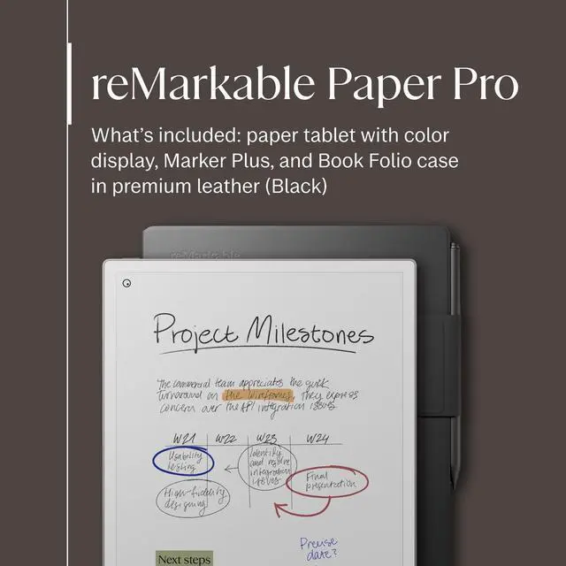 THE ULTIMATE PAPER TABLET For the first time on a reMarkable paper tablet, you can write, sketch, and read in color. Ultra-slim and portable, but with a full-size 11.8 color display, adjustable reading light, and an unmatched paper-like writing experience. ^^ WHATS IN THE BOX Youll find reMarkable Paper Pro, a digital notebook for unprecedented paper-like writing with 11.8 Canvas Color display; Marker Plus, the reMarkable pen with built-in eraser; 6 spare Marker tips; Book Folio, a stylish protective cover in premium black leather; and USB-C cable.