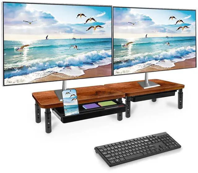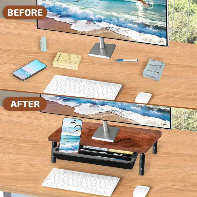STORAGE DRAWER - The monitor stand with drawer has a phone/ipad holder, a pen/stationery slot in the middle, and two storage compartments for gadgets, tabs, post-it notes, and business cards. It makes it simple to store office supplies and accessories, which helps keep your working space clean and neat and is ideal for desk organization.