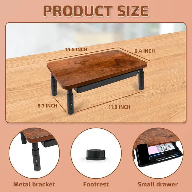 3 LEVELS OF HEIGHT & ANGLE - This wood monitor stand features 3 height settings at 4.5 inches, 5.3 inches, and 6.1 inches tall. It can be adjusted up and down in height and tilt by pressing the buttons on the legs to adjust the stand. Choose the most comfortable and ergonomic viewing height.