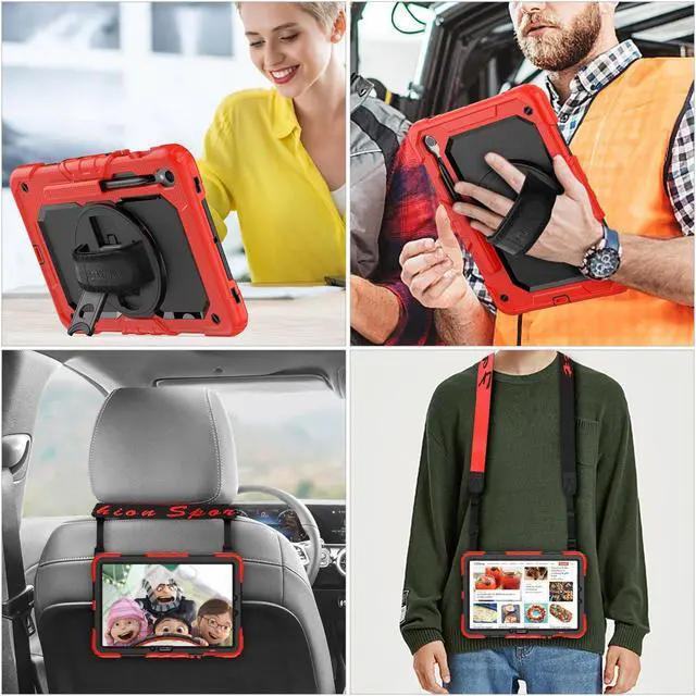 SEYMAC stock Case for Samsung Galaxy Tab S10 FE / S9 / S9 FE 5G Tablet Case Protective with Screen Protector, Pencil Holder, 360 Rotate Stand, Hand Strap, Shoulder Strap, Red
