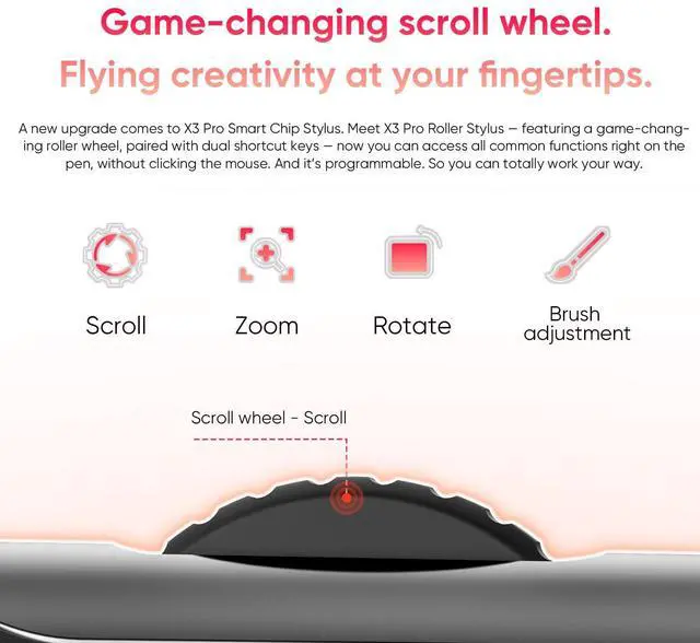 Game-changing scroll wheel: A new upgrade comes to X3 Pro Smart Chip Stylus. Meet X3 Pro Roller Stylus -- featuring a game-changing roller wheel, paired with dual shortcut keys -- now you can access all common functions right on the pen, without clicking the mouse. And it's programmable. So you can work your way as you want