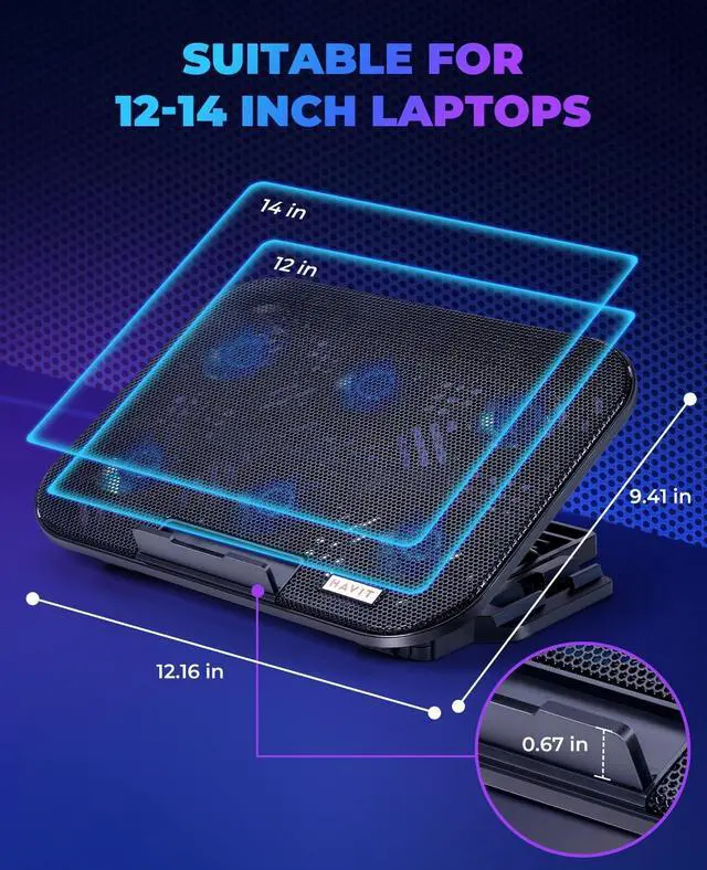 Maximum Cooling: Our laptop cooler is equipped with 6 ultra-quiet fans that provide superior airflow to cool down your 12- 14.1 inch laptops quickly and efficiently, keeping your device running at optimal temperatures ^^ 6 Adjustable Heights for
