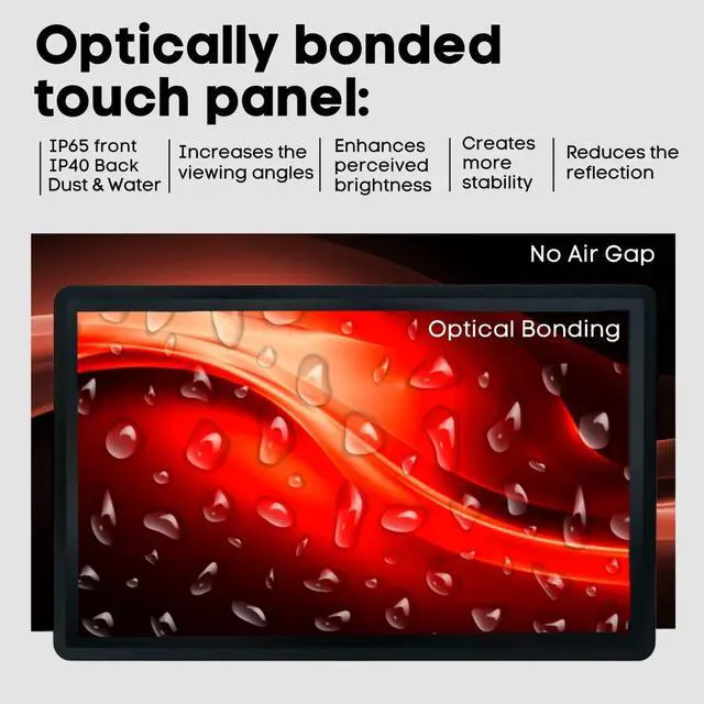 Faytech Clear Bond Technology. Optically Bonded Touchscreen has no air-gap, resulting in perfect visual clarity and improved viewing angles with no optical distortion.