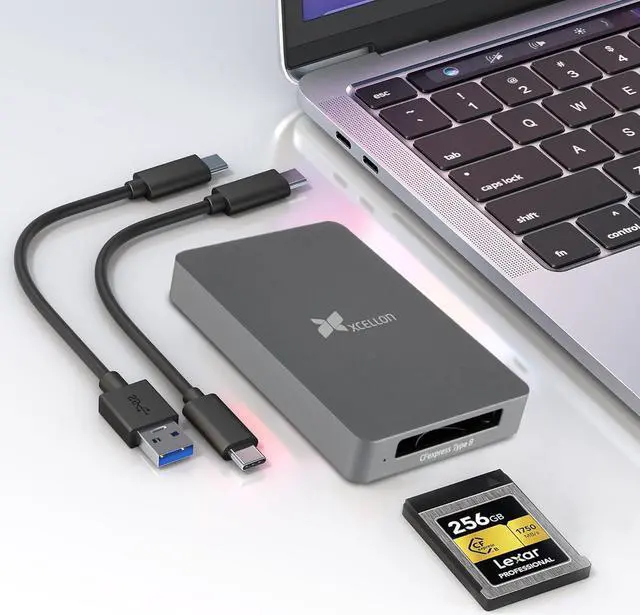 XCELLON CFexpress Type B Card Reader with USB 3.2 Gen 2, 10Gbps High-Speed Data Transfer, USB C to USB C/USB A Cable, Aluminum Enclosure, Push Lock and Security LED Indicator