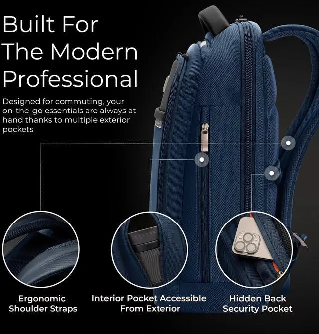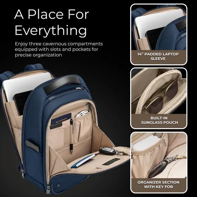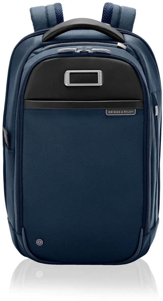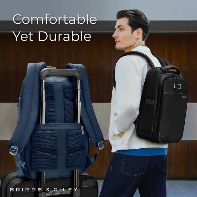 EVERYDAY BACKPACK - Whether for work or weekend travel, this slim backpack offers quick access to essentials with a front slip pocket, RFID protection, and ergonomic padded straps for comfort ^^ PREMIUM CRAFTSMANSHIP - Made with superior materials and durable top-grain leather handles, this backpack is built to last. Its elegant personalization options ensure it's uniquely yours ^^ SLIM YET SPACIOUS - Despite its compact size, the backpack offers ample storage including a tech compartment with a padded laptop sleeve, a front pocket organizer, and a water bottle pocket ^^ THOUGHTFUL DETAILS - The backpack features a hidden back security pocket, a SpeedThru pocket for easy access to essentials, and a key fob for organized storage, along with a built-in sunglasses pouch ^^ TRAVEL WITH CONFIDENCE - Crafted for long-term use, Briggs & Riley bags are designed with high-grade materials and come with lifetime repair service for damage from normal use