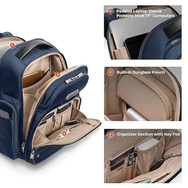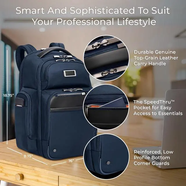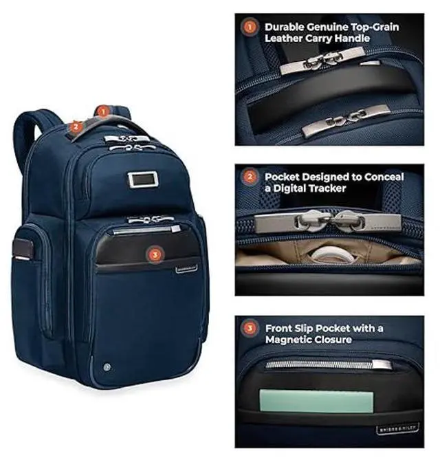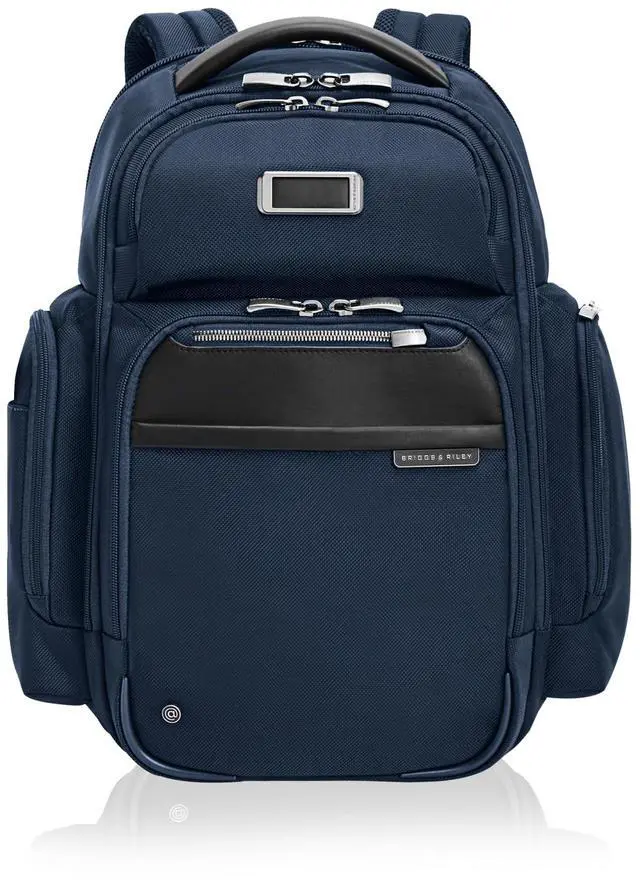 EVERYDAY BACKPACK - Whether for work or weekend travel, this large cargo backpack offers quick access to essentials with a front slip pocket, RFID protection, and ergonomic padded straps ^^ PREMIUM CRAFTSMANSHIP - Made with superior materials and durable top-grain leather handles, this backpack is built to last. Its elegant personalization options ensure it's uniquely yours ^^ ORGANIZED AND SPACIOUS - This large cargo backpack features a multi-compartment design, offering a dedicated tech compartment that fits 17" laptops. It provides ample storage for your personal items ^^ THOUGHTFUL DETAILS - The backpack features a hidden back security pocket, a SpeedThru pocket for easy access to essentials, and a key fob for organized storage, along with a built-in sunglasses pouch ^^ TRAVEL WITH CONFIDENCE - Crafted for long-term use, Briggs & Riley bags are designed with high-grade materials and come with lifetime repair service for damage from normal use