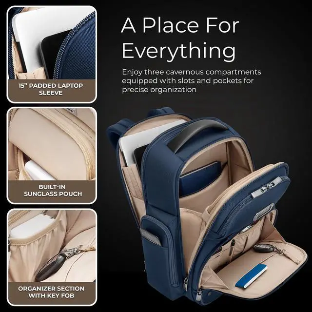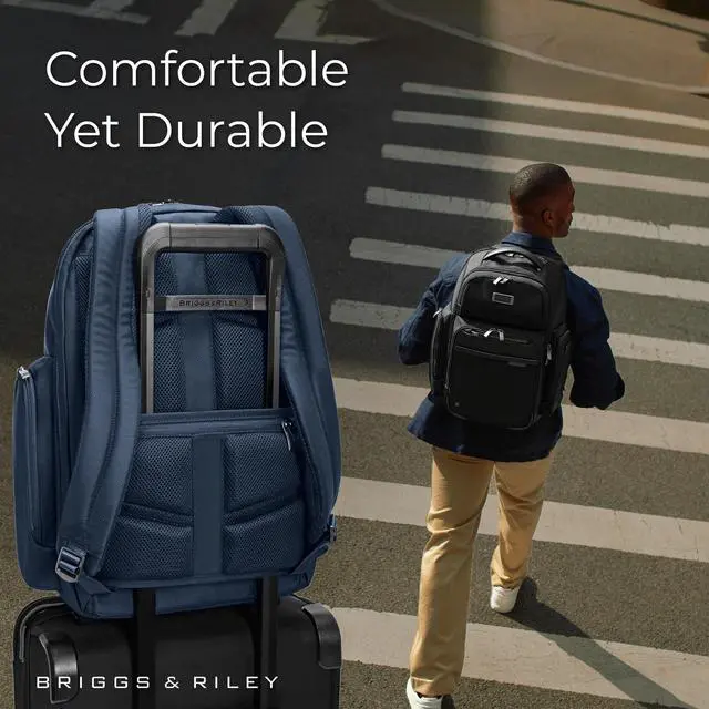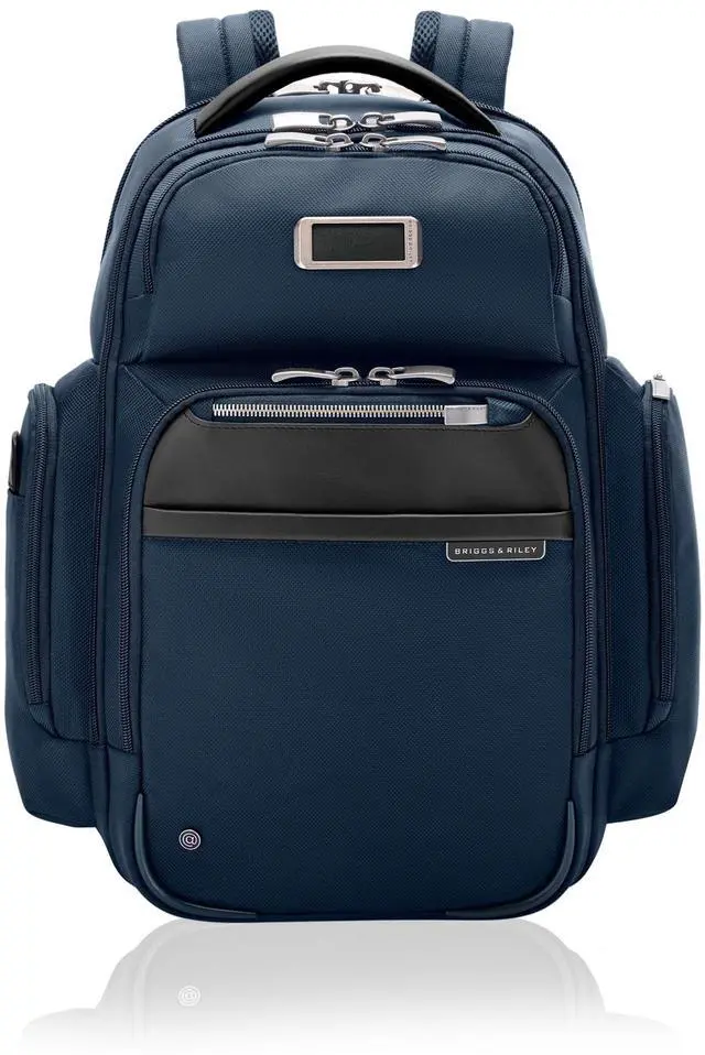EVERYDAY BACKPACK - Whether for work or weekend travel, this medium cargo backpack offers quick access to essentials with a front slip pocket, RFID protection, and ergonomic padded straps ^^ PREMIUM CRAFTSMANSHIP - Made with superior materials and durable top-grain leather handles, this backpack is built to last. Its elegant personalization options ensure it's uniquely yours ^^ ORGANIZED AND SPACIOUS - This professional backpack combines a three-section design with a variety of pockets to help you carry everything efficiently. The tech compartment fits up to 15" laptops ^^ THOUGHTFUL DETAILS - The backpack features a hidden back security pocket, a SpeedThru pocket for easy access to essentials, and a key fob for organized storage, along with a built-in sunglasses pouch ^^ TRAVEL WITH CONFIDENCE - Crafted for long-term use, Briggs & Riley bags are designed with high-grade materials and come with lifetime repair service for damage from normal use