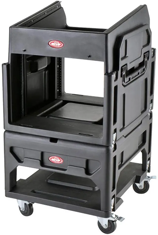 The front facing 8U steel rails provide enough space for amps or outboard gear. 8U Rear rack rails are included for additional mounting, storage and support. In the same fashion as the Mighty Gig Rig, the lid can also be used as a pedestal for the 1SKB19-R1208 Gig Rig. By placing the lid on the bottom wheeled skid and locking down the Gig Rig on top, the mixer height has perfect performance position. The 1SKB-R1208 Gig Rig includes two injection molded extra-long handles, (one per side) for easy lifting in transport.