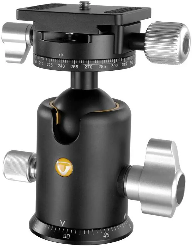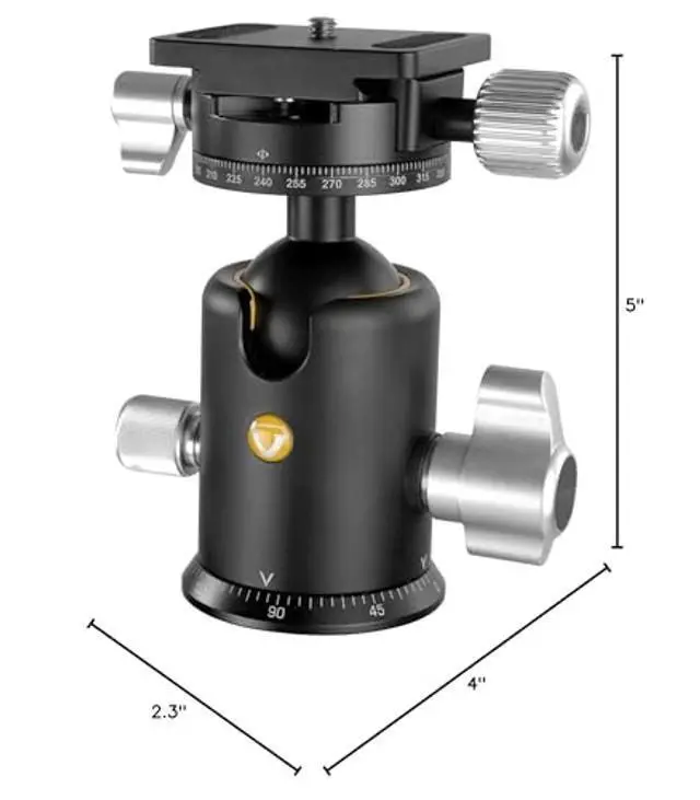 Precision CNC-machined from aircraft-grade aluminum to be lighter, stronger, and more durable. Holds up to 55 pounds of gear, but only weighs 1.4 lbs ^^ Dual-axis design offers a second panoramic twisting axis on top plate that delivers precision from any position ^^ Easy-grip locking knobs let you loosen and tighten with ease, even in damp conditions or while wearing gloves ^^ Ultra-secure Arca-compatible QS-62V3 plate with an innovative dual safety pin system to keep your camera safe ^^ Adjustable locking knob mechanism to ensure that your setup is comfortable and convenient