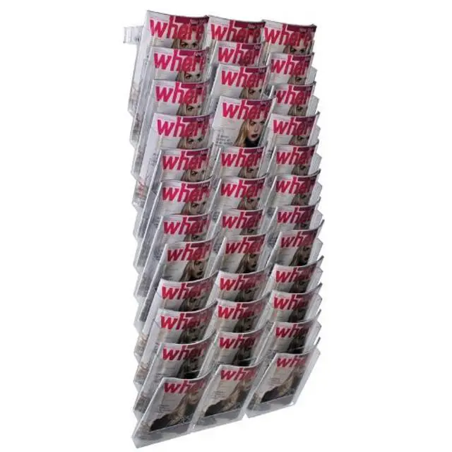 36-pocket bi-fold wall mount display. Use for printed material measuring 6-Inch W x 9-Inch H. Made of crystal styrene.