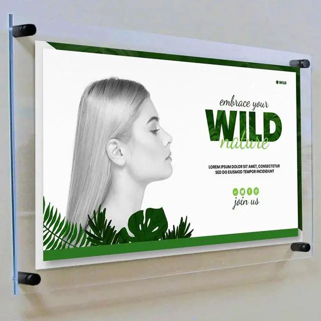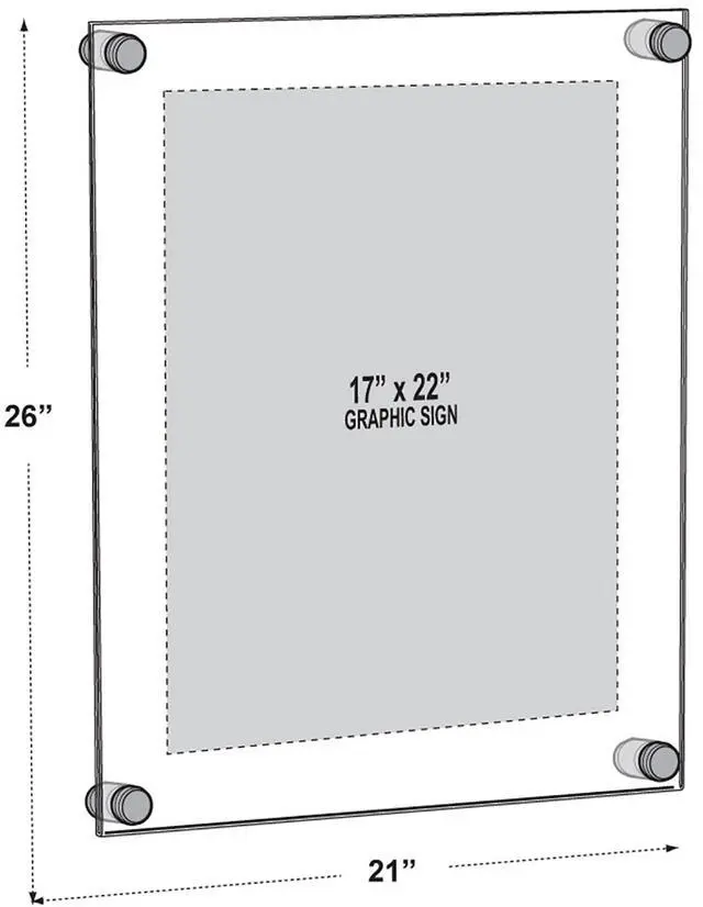 format sizes: 24 x 36 and 30 x 40 include 6 standoffs and caps. Easy to change the sign or photo, simply unscrew the front gold cap and switch out the graphic. There is no need to remove the frame from the wall once it is affixed. The edges are flame polished giving these floating picture holders a high end finish with a touch of fancy. Hang these beautiful acrylic frames in boutiques, museums, trade shows, hotel lobbies, restaurants, retail stores, schools, at work or at home. Sold in Multiples of 1.