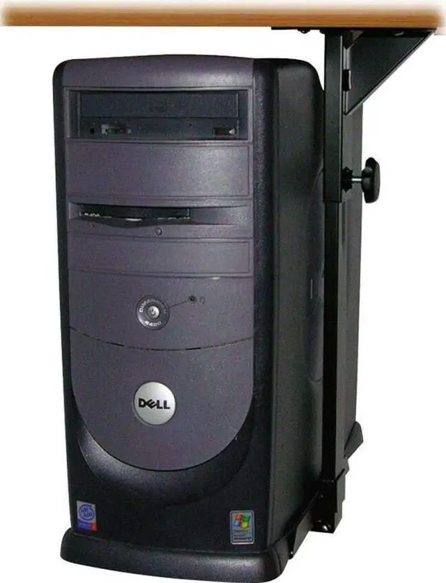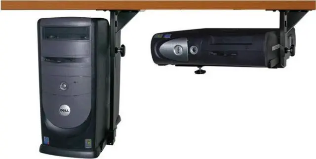 CPU holder saves valuable desktop space by securely mounting your CPU vertically or horizontally on underside of workstation. Design keeps CPU at comfortable height to provide access to disk drives and cable connections. With the horizontal setup, the width adjusts from 13-1/10" to 25-7/10", and the height adjusts from 5-1/4" to 10". With the vertical setup, the width adjusts from 5-1/4" to 9-4/5" and the height adjusts from 13-1/10" to 17-9/10". CPU holder also offers durable steel construction for sturdy support.