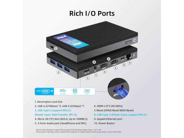 - PD-enabled Charging Port - The left USB type-C port of this small pc adopts the PD technology, is compatible with multiple PD powerstations, makes your computing easy while on the trip, outdoor, car etc (Please make sure the power supply is over 24W to support to boot up the computer)