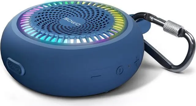 SOWO Bluetooth Shower Speaker Waterproof - Small Portable Speaker Wireless with Louder Volume and Powerful Bass - Colorful Lights and 10H Playtime - Lightweight with Carabiner and TWS - Blue