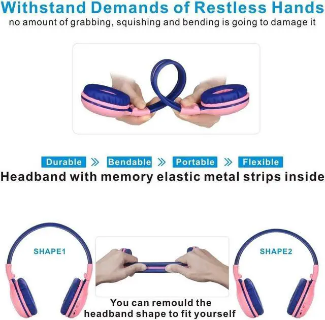 Wireless Bluetooth Headsets for Toddlers with Flexible Headbands & Noise Isolation -- Adjustable headband with memory stainless steel strips give the headphones some impressive durability and flexibility. Whats more, the extra detachable Nylon fastening straps Need to buy separately from SIMOLIO brand storecan be added to the headbands to get the perfect fit for the toddlers. Over-ear headphone isolates from outside noise to make you hear clear sound. And we use some nifty engineerin