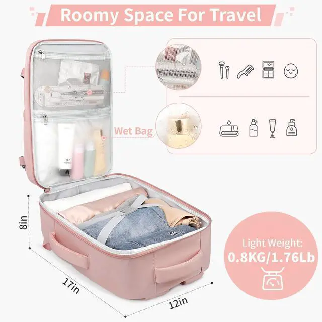 Flight Approved Carry on Backpack: The TSA backpack for travel school measures 17*12*8 inches and weighs 0.8 kg(1.76 lbs). This travel backpack for women men traveling features a 180 degree zipper closure to help you pass through security check quickly, compliant with airline carry-on requirements. Can be a personal item travel bag fits overhead bin or under the seat and save on paying any extra baggage fees