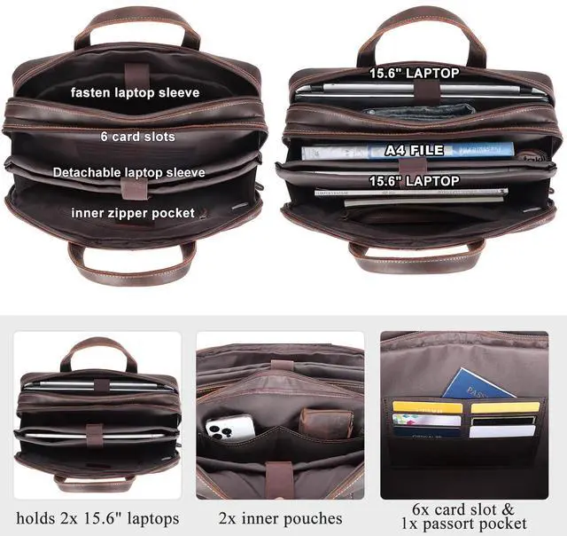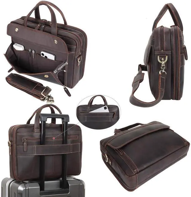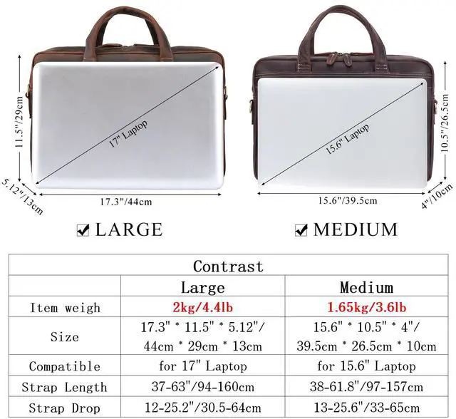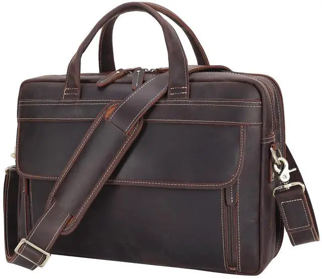 Sturdy Leather Briefcase Bag This medium brief case fits most of 15.6" laptops, made of 2mm thick premium full grain leather, outfitted with ykk zippers,heavy duty hardware,tear-resistant liner and handcrafted by skilled artisans to last for decades. The leather is processed with crazy horse leather tech, featured with durability and distinctive rough weathered look as its new. It goes better with age,the more you use the bag, the shinier newer look it'll be.
