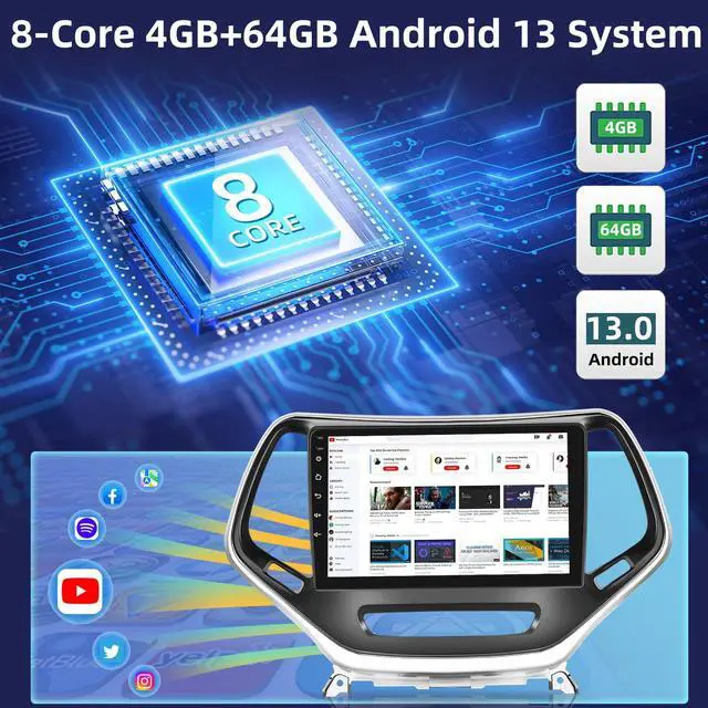 8 Core CPU & Android 13 SystemThis upgrade Jeep Cherokee radio comes with a 8-Core CPU, 4GB RAM + 64GB ROM and the latest Android 13 system, making the 10.1 inch Jeep Cherokee stereo performance even better. And our radio has 1280*720 IPS HD larger and clearer screen, give you wonderful visual experience.