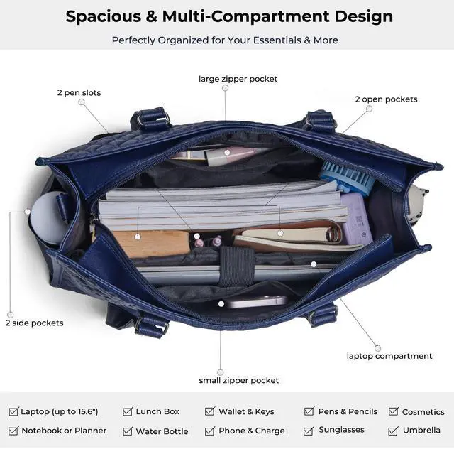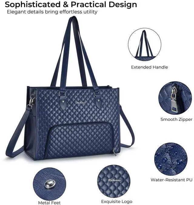 Ralnitote Laptop Tote Bag with Insulated Lunch Compartment for Women, PU Leather 15.6 Inch Work Bag, Elegant Computer Handbag, Versatile Business Tote for Office, Travel or Casual-Midnight Blue