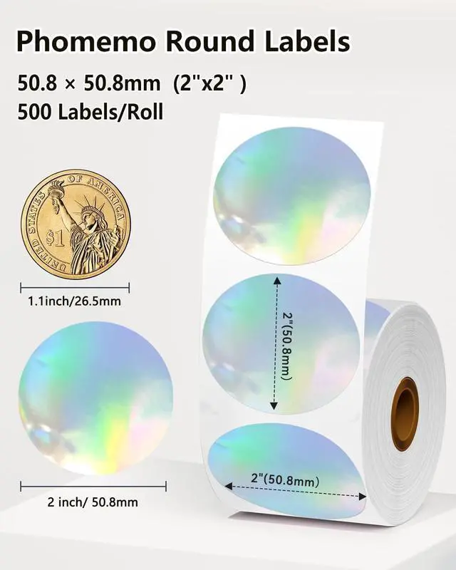 SpecificationsAuthentic Phomemo Labels--Round thermal sticker with the size: 2" circle (400 Labels/Roll, Color Laser), Paper tube diameter: 1.19"(30mm) Paper roll diameter: 3.35"(85mm). Exclusive for thermal printers.