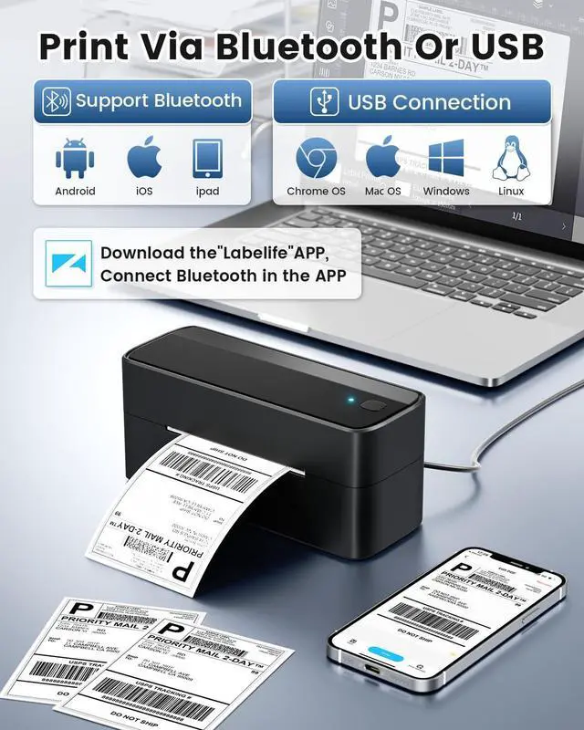 Print Wirelessly - Phomemo Bluetooth Shipping Label Printer supports wireless printing through bluetooth connection. For IOS and Android, need to download the "labelife " APP from Apple Store or Google Play. With easy and simple operations, you can easily print your documents, photos, and more, making your life more convenient!