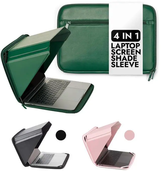 15-16" MacBook Laptop Sun Shade Sleeve with Built-in Hood | 4-in-1: Screen Shade, Privacy, Heat Protection, Contrast Enhancement | Made in Hemp and Vegan Leather - Green