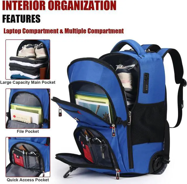 SPACIOUS & ORGANIZED: Unpack convenience with this well-designed luggage backpack. The main compartment, with dimensions of 21"x14"x9", includes a padded sleeve for laptops up to 18 inches, perfect for business trips. Additional features include a slim compartment for magazines, a quick pocket for passports, a front organizer with a key hook, and side mesh pockets for bottles. This backpack with wheels is ideal for keeping your essentials in order while you travel.
