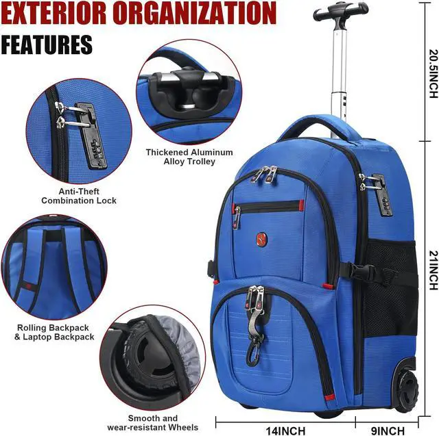 TOP TRAVEL PICKS: Elevate your travel experience with our versatile rolling backpack by StarCloud, a top pick for those who appreciate functionality and style. Sized at 21"x14"x9" (including wheels) and boasting a generous 45L capacity, this carry on backpack is a thoughtful choice for international business trips, college life, or weekend getaways. Weighing only 5.95 lbs, it's the perfect travel companion for professionals, commuters, and college alike.