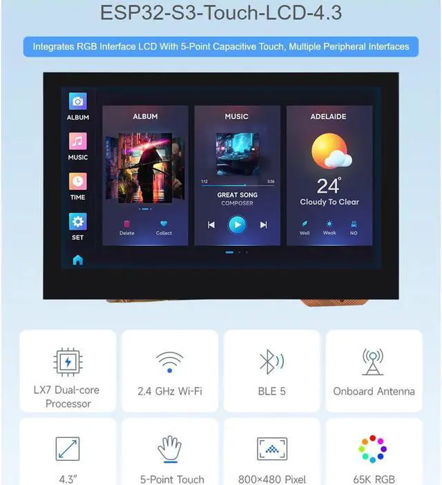 ESP32-S3 4.3 inch Capacitive Touch Display 800x480 Based on ESP32-S3 Microcontroller 5-Point Touch, 32-Bit LX7 Dual-Core Processor, Up to 240MHz, Support 2.4GH z W-iF-i & Blue-Too-th 5