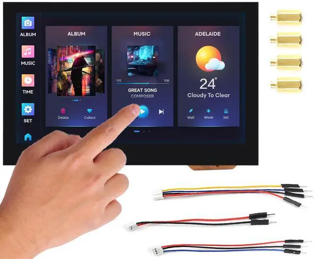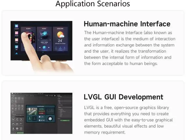 Onboard 4.3inch capacitive touch display, 800×480 resolution, 65K color. Can smoothly run GUI programs such as LVGL.