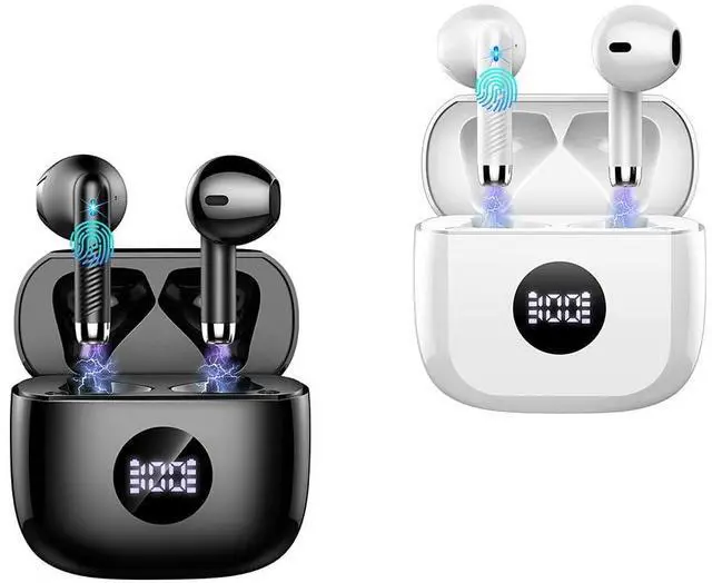 Jxrev J53 2 Pack Black and White Wireless Earbuds, Bluetooth Ear Buds LED Power Display Headphones Bass Stereo, Earbuds in-Ear Noise Cancelling Mic, 40H Playback Mini Case