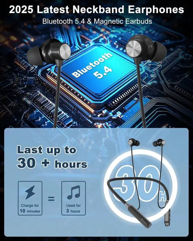 Hmusic H06 Neckband Bluetooth Headphones, Wireless Earbuds Bluetooth 5.4, 30H Long Battery Life, 33g Lightweight, IPX5 Waterproof, in-Ear Magnetic Buds, Around The Neck Earphones for Sports/Game/Running
