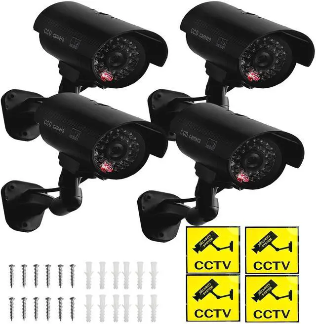 JYtrend Fake Camera, Dummy Camera CCTV Surveillance System with Realistic Red LED Flashing Light for Outdoor and Indoor + Warning Sticker (4 Pack, Black)