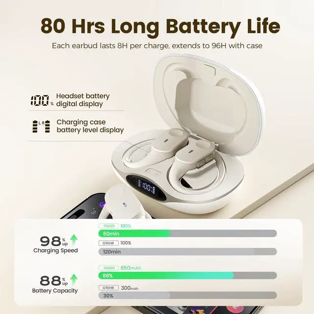 Up to 80 hours of playtime: Wireless earbuds offer up to 8 hours of playtime on a single charge, and with the charging case, you can enjoy up to 80 hours of music. The LED digital display shows real-time battery status, ensuring youre never caught off guard by battery issues. Supports Type-C wired charging and Qi wireless charging (Not included). Perfect for all your sports headphones needs, providing long-lasting performance for your wireless earbuds workout.