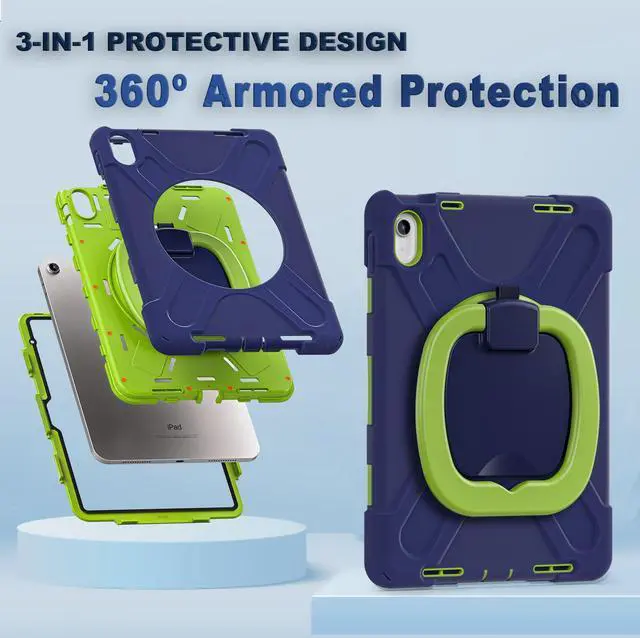 BKOUNCTK for iPad (A16) 11th/10th Generation Case 2025/2022 (11/ 10.9 ), Heavy Sturdy Shockproof Kids Case with Screen Protector, Rotating Stand/Pencil Holder/Shoulder Strap - (Navybulue+Lime)