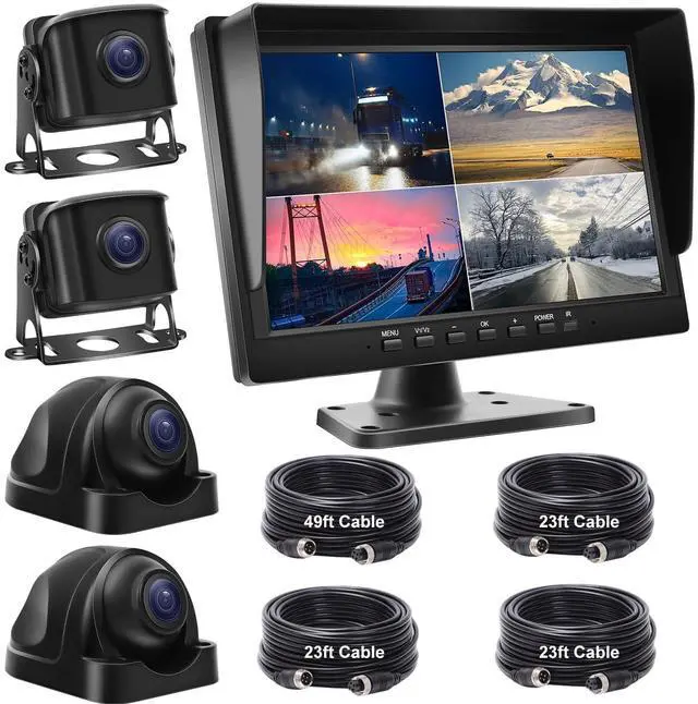 Wired Backup Camera System with 10.1 IPS Monitor for Truck RV Trailer Bus, Rear View Camera, with Side Front View Camera, 4 Split Screen, Super Waterproof, Night Vision, Easy Installation AHD1080P
