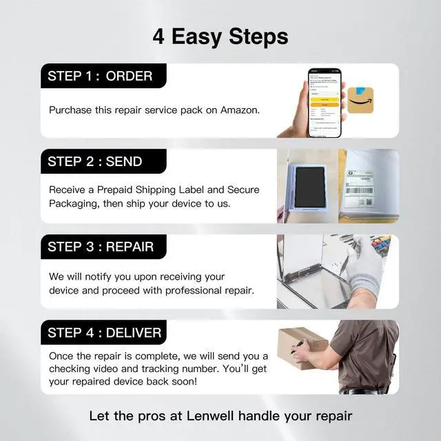 [ What You Will Get ] YOU WILL GET AN EMPTY BOX with a prepaid shipping label. This Service Pack specializes in repairing service for you after getting your device!!! After finishing repairing it, we will send back the device to you and provide its tracking number. You will find Lenwell significantly less expensive than local phone repair stores!!! Lenwell is a proficient team of majoring in repairing .Thereby efficiently saving your time, which is in Houston and capable of swiftly repairing.
