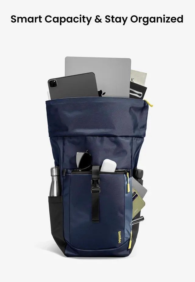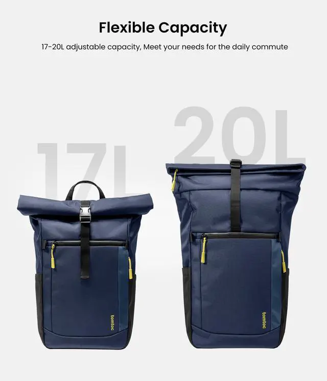 tomtoc T61 Laptop Rolltop Backpack: This stylish rolltop backpack is adjustable in volume, combining modern aesthetic with practicality. A casual daypack that is perfect for daily commute. Dimensions: 17.72 x 11.42 x 5.51 inches, Volume: 17-20L