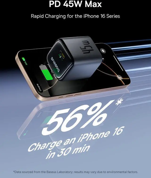 45W Fast Charging: Baseus 45 watt usb c charger with latest PPS/PD 3.0 fast charging technology, charge your iPhone 16 series and Galaxy S24 in record time with this powerful 45W USB-C charger. Enjoy up to 56% battery for iPhone 16 and 61% for Galaxy S24 in just 30 minutes. For Super Fast Charge 2.0, use a 5A charging cable.