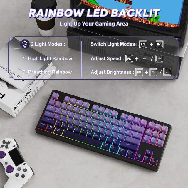Vibrant Customizable Rainbow Backlit Personalize your setup with 16.8 million colors and 18 dynamic effects. Adjust brightness (FN+/) and animation speed (FN+/) instantlyno software needed. Switch backlight modes with FN+INS for gaming, work, or mood lighting.