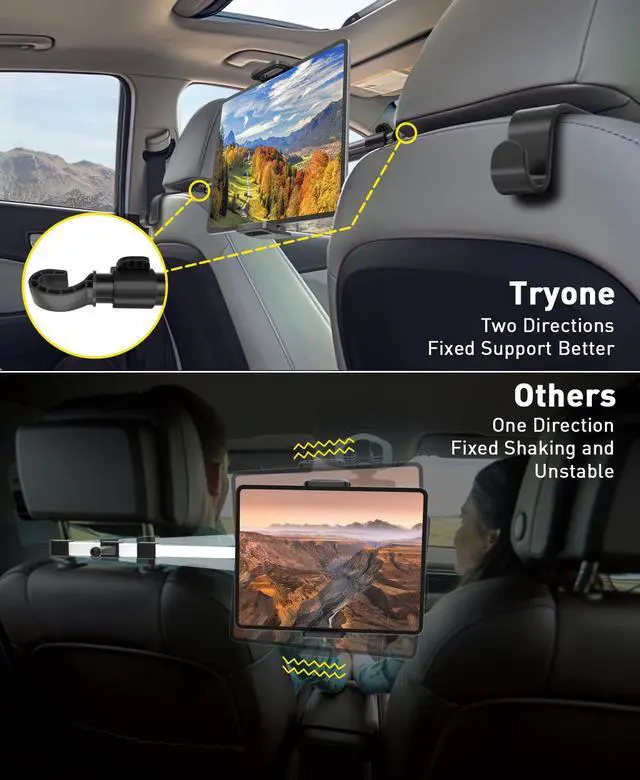 Best Viewing Angle This Tryone Car Tablet Holder is specially designed for the rear seat, the tablet holder can be adjusted left and right, with 360° rotation and 75° tilt, whether it is one passenger, two passengers or three passengers, this headrest mount will provide the best viewing position
