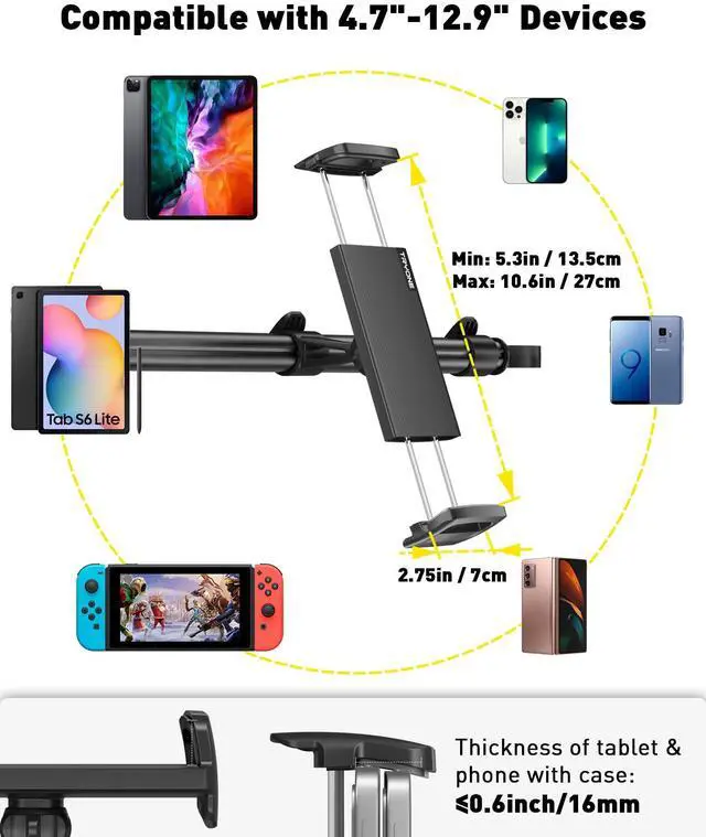Wide Compatibility The headrest tablet holder is compatible with all 4.7-16.1 inch devices, such as iPad Pro 9.7, 10.5, 2022 Newest iPad Pro 11, 12.9, iPad mini 3 4 5 6, iPad Air 2 3, iPad 2 3 4 5 6, iPhone 13 12 Pro XS Max XR X 6 7 8 Plus, Galaxy Tab, Surface Pro, Pixel C, Nexus 7 9, Tab E 4, Fire HD, Kindle, Switch and more