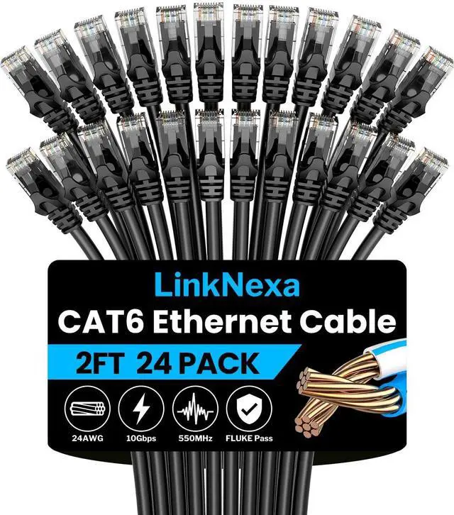 LinkNexa Cat 6 Ethernet Cable 2ft (24 Pack), High Speed 10Gbps Network Cable, UTP 24AWG Flexible RJ45 LAN Internet Cable for Computer, Router, Modem, PS4/5, Xbox, Gaming, Black