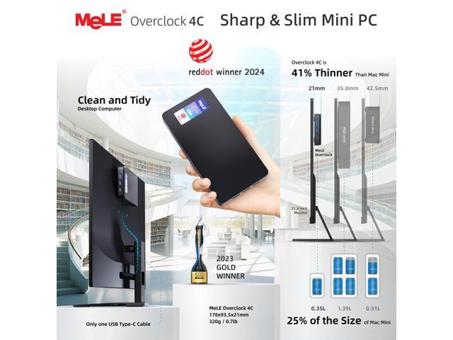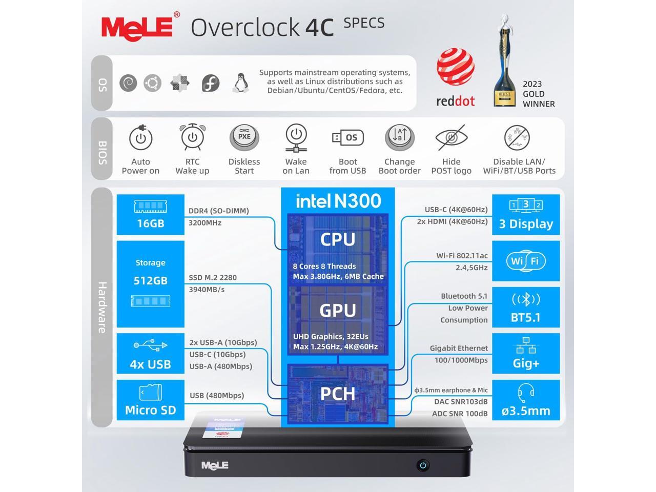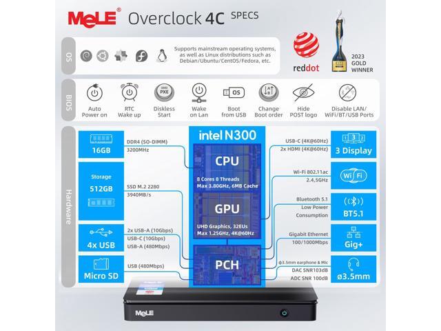 MeLE Overclock4C N300 Mini PC (up to 3.8GHz 8C/8T) 16GB DDR4 512GB Micro Desktop Computer, 4K Triple Display, All-in-one USB-C, USB3.2/WiFi/BT/Ethernet on Business Home Office